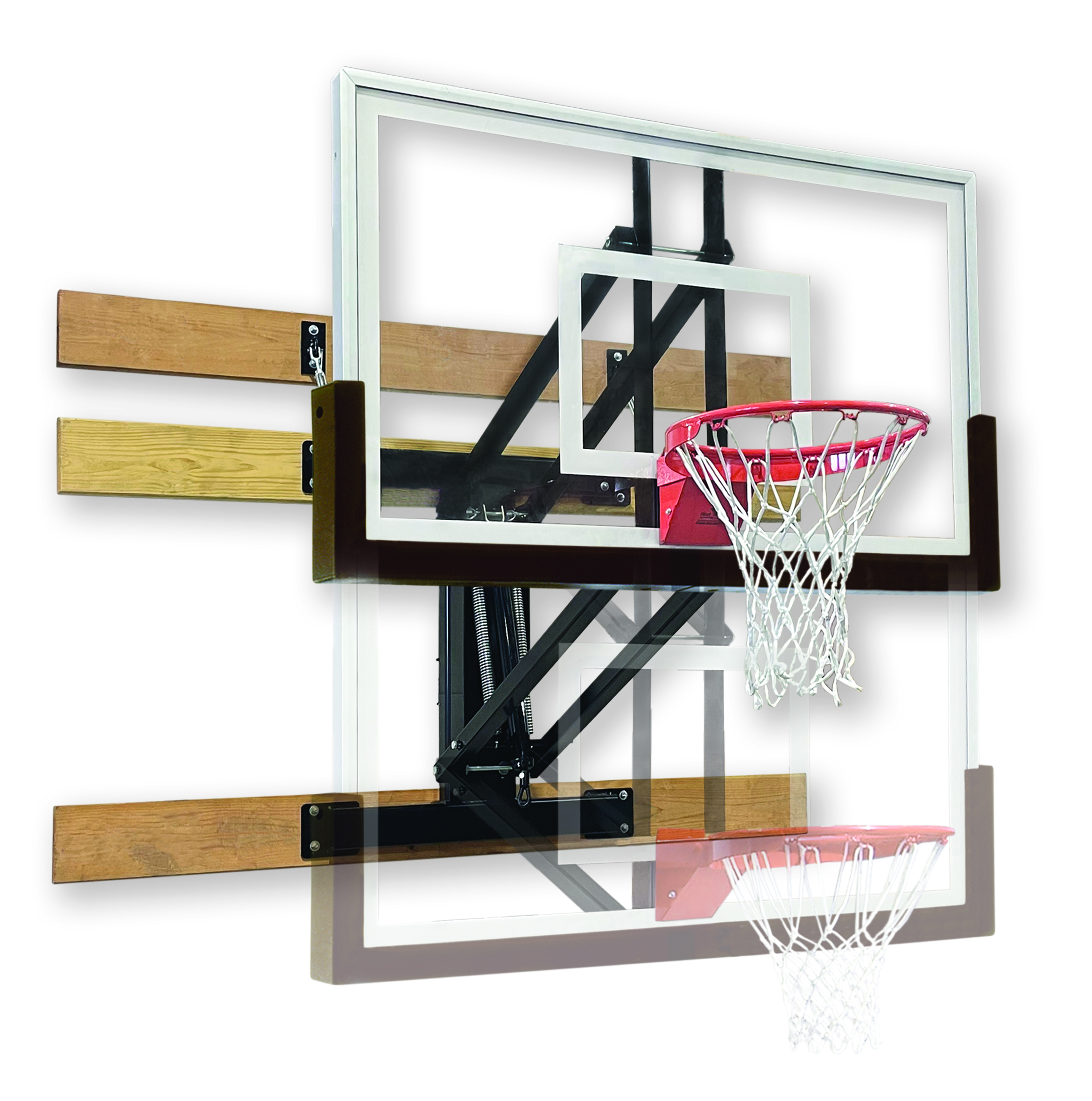 The uni-strut mounting system provides many options for securely mounting the structure to most any wall. The rim height is adjusted with an awning crank and the rim height ranges to any point from 10′ to 7′. The distance from the backboard to the wall is 36″ when the rim height is at 10′.