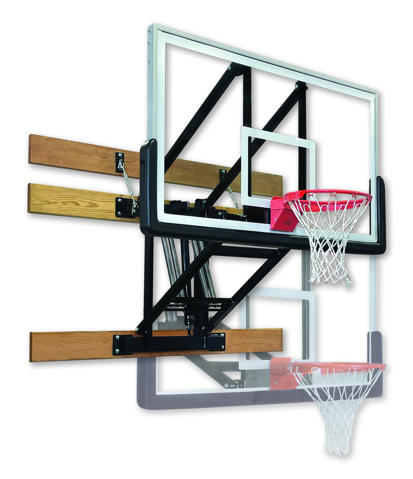 The rim height on the WallMonster is adjusted using a detachable awning crank. The backboard has the option of being mounted either 36″ or 48″ from the wall (when the rim is at 10′). The rim height adjusts from 10′ to 6′ when the 36″ distance is used and 10′ to 7’6″ when the 48″ option is chosen.